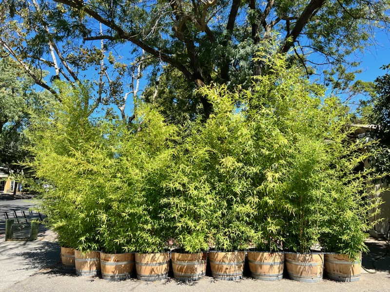 Figure 2. Phyllostachys aurea 'Flavescens Inversa' growing for the purpose of privacy screening in half wine barrel planters. This bamboo is a small statured low branching running bamboo and it is one of the best running bamboos for privacy screening in containers or in-ground plantings with rhizome barrier.